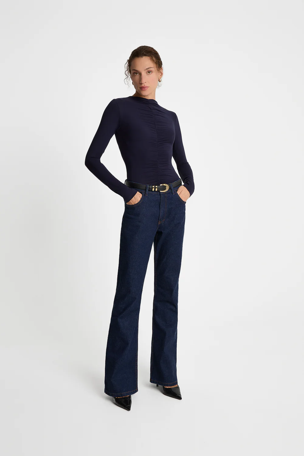 Stylowe body damskie w odcieniu głębokiego granatu to elegancka baza kobiecej garderoby. Fason ze stójką i efektownym drapowaniem z przodu podkreśla sylwetkę i dodaje całości ozdobnego charakteru, dzięki czemu sprawdzi w wielu stylizacjach.