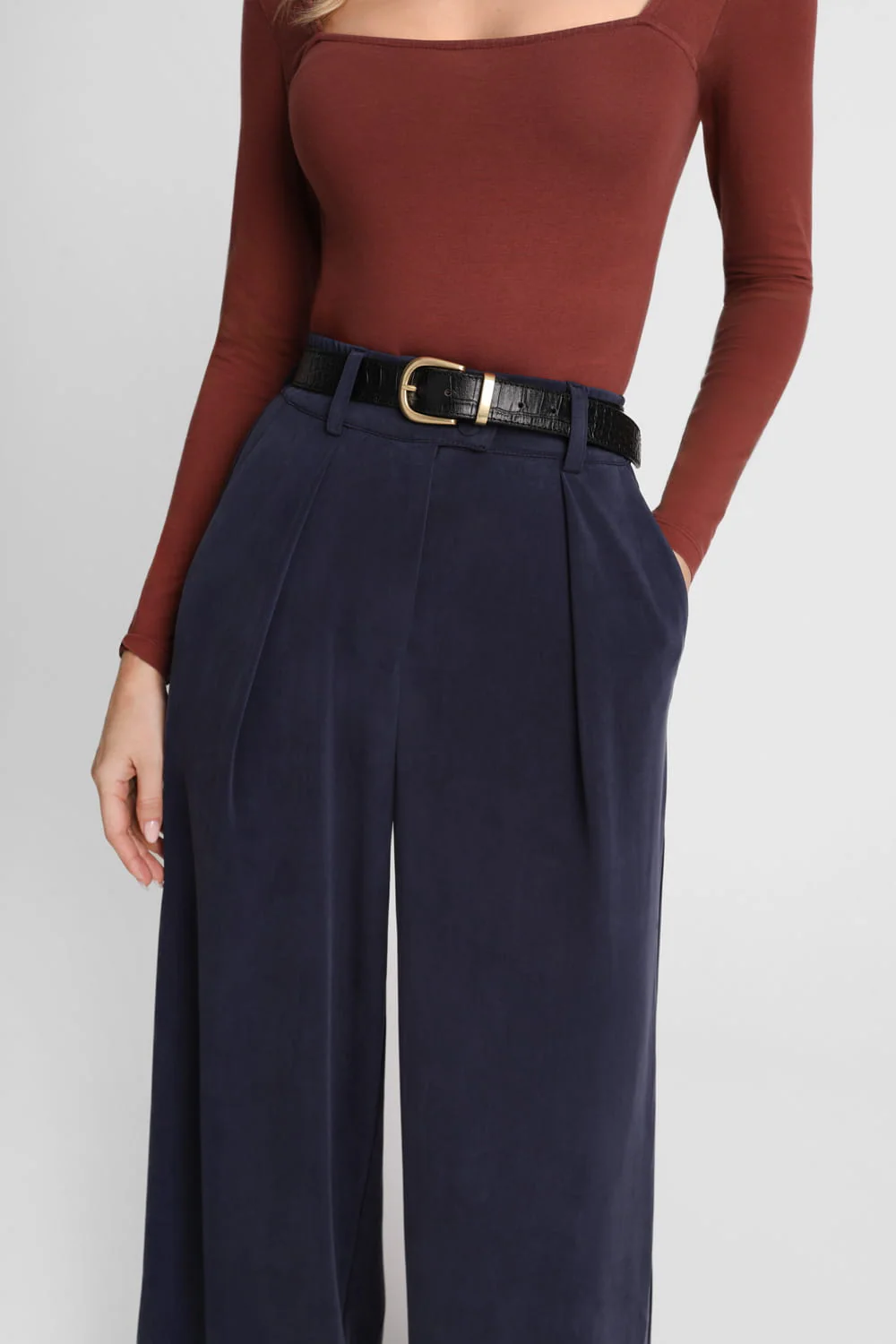 Uniwersalne, stylowe i wygodne – granatowe spodnie wide leg damskie Miss Daily Navy to pozycja obowiązkowa w każdej szafie. Ich swobodny fason i szerokie, elegancko układające się nogawki sprawiają, że doskonale wpisują się w codzienne i bardziej formalne stylizacje. Dzięki dzianinie o strukturze przypominającej tkaninę, spodnie są wyjątkowo miękkie i przyjemne w noszeniu. Detale, które robią różnicę? Zakładka na nogawce, która dodaje im objętości, zapięcie na zamek i powlekane guziki, zapewniające perfekcyjne dopasowanie. Komfort noszenia zwiększa również elastyczna guma wszyta w pasie, dzięki której spodnie delikatnie dopasowują się do sylwetki. To model, który łatwo zestawisz zarówno z elegancką koszulą, jak i . Granatowe spodnie wide leg damskie Miss Daily Navy świetnie sprawdzą się także jako alternatywa dla klasycznych chinosów czy garniturowych fasonów, a ich ponadczasowy odcień pasuje do wielu typów urody.