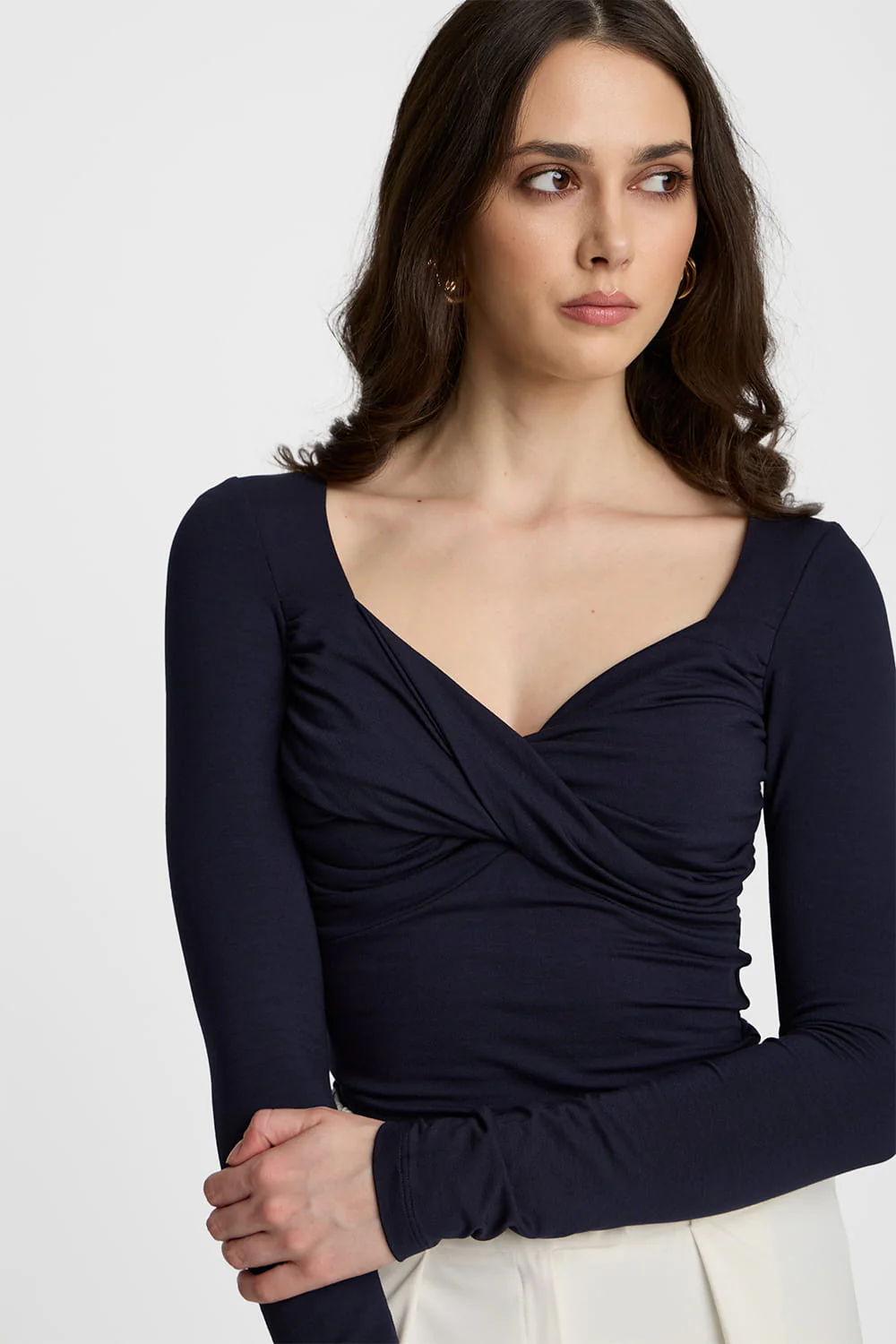 Granatowy dopasowany longsleeve damski z ozdobnym węzłem to niebanalna propozycja dla kobiet, które cenią zarówno wygodę, jak i wyjątkowy design. Miękka dzianina z przewiewnego modalu zapewnia komfort noszenia przez cały dzień, a dopasowany fason subtelnie podkreśla figurę. Dekolt w kształcie litery V oraz ozdobne marszczenie w formie węzła na biuście sprawiają, że ten model przyciąga uwagę i nadaje stylizacji unikalnego wyrazu. Podwójna warstwa dzianiny na biuście zapewnia komfort, pozwalając na noszenie granatowego longsleeve'a damskiego z węzłem na biuście bez dodatkowego wsparcia. Idealny na co dzień, do eleganckich spodni lub casualowych jeansów.