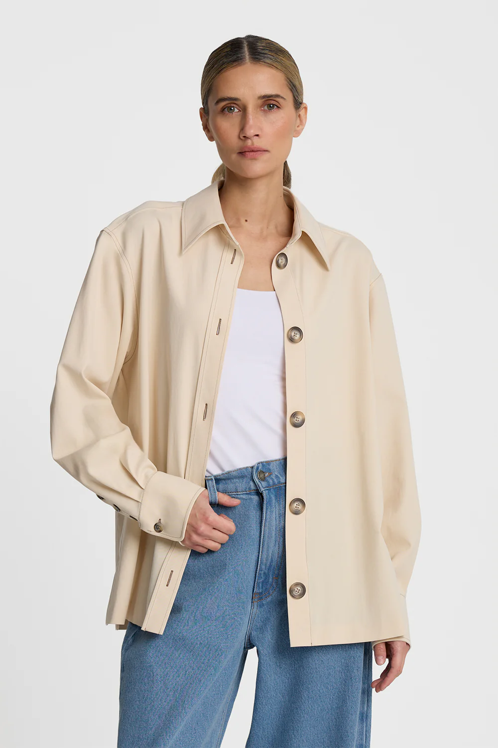 Model ma swobodny fason, który zapewnia komfort noszenia i nowoczesny wygląd. Koszula zapinana jest na duże guziki z naturalnego rogu, stanowiące wyrazisty, biżuteryjny akcent. Klasyczny kołnierz został wzmocniony wszytą fiszbiną, dzięki czemu pięknie trzyma formę i zachowuje swój kształt przez cały dzień. Kontrastowe przeszycia podkreślają konstrukcję koszuli i dodają jej współczesnego charakteru.
