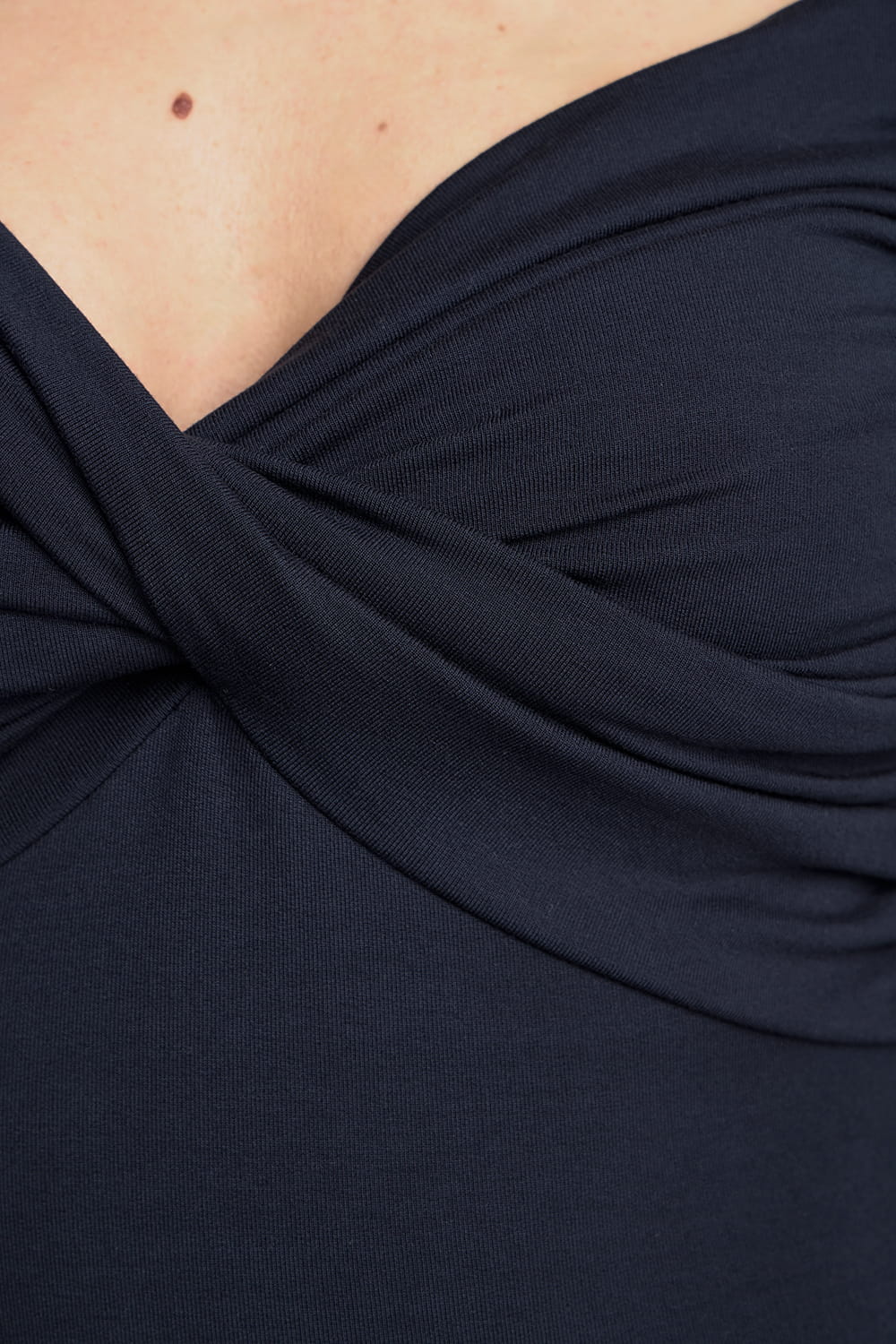 Dopasowana sukienka midi w odcieniu głębokiego granatu to idealna propozycja dla kobiet, które cenią połączenie klasyki i nowoczesnego stylu. Uszyta z miękkiej, lejącej dzianiny, delikatnie opływa sylwetkę, podkreślając jej kształty i zapewniając komfort noszenia. Drapowany kopertowy dekolt dodaje kobiecości i subtelnie eksponuje linię szyi, podczas gdy długość do połowy łydki zapewnia elegancki i uniwersalny charakter. Z długimi rękawami i przemyślanym krojem, ta granatowa dzianinowa sukienka midi świetnie sprawdzi się zarówno na wieczorne wyjście, jak i do pracy czy na rodzinne spotkanie. Miękka dzianina z dodatkiem elastanu dopasowuje się do ciała, zapewniając swobodę ruchów.