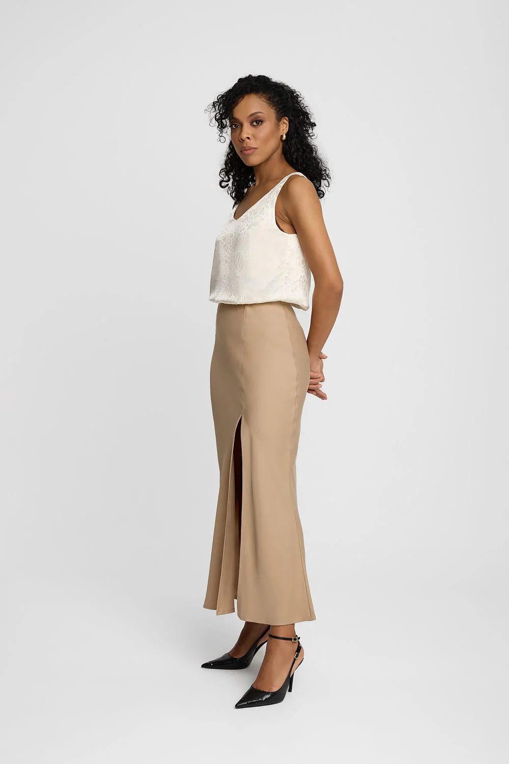 Przed Wami nowa wersja topu, dla którego bazą był model Miss Female. Tym razem sięgneliśmy po piękną, satynową wiskozę w żakardowy wzór, która dodaje szampańskiemu wiskozowemu topowi z dekoltem V modowego smaczku. Miss Whisper szyjemy z dwóch warstw tkaniny, co zapobiega prześwitywaniu. Krój regular fit sprawia, że szampański wiskozowy top na grubszych ramiączkach sprawdzi się przy każdej sylwetce. Jego ponadczasowy fason idealnie współgra zarówno z damskimi garniturami, jak i jeansami. A Ty, na jaką okazję go założysz?