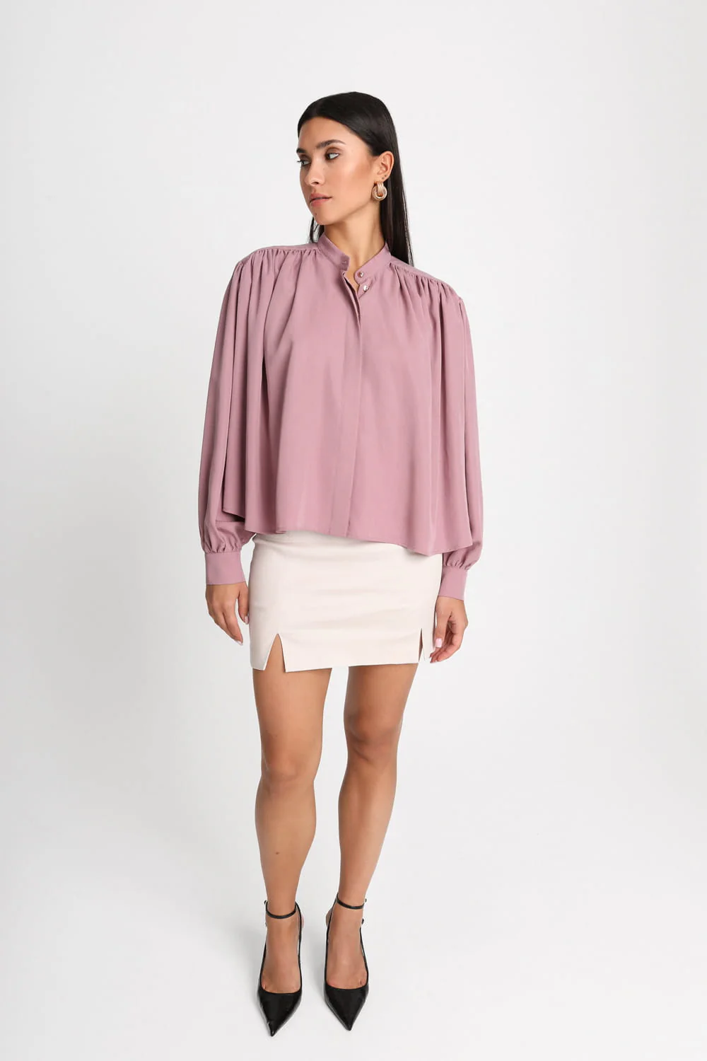 Jeśli szukasz nowego spojrzenia na damską koszulę, jesteś w dobrym miejscu! Miss Collected to oversize’owa wrzosowa koszula damska bez kołnierzyka, której prosty i jednocześnie niesztampowy krój urozmaici każdą stylizację. Drapowanie na ramionach tworzy efekt falbany, a duża objętość rękawów w połączeniu z lejącym się tencelem, dodaje temu modelowi lekkości. Damska wrzosowa koszula bez kołnierza jest zapinana na małe guziki – jedynie ten pod szyją jest ozdobny. Nieco krótsza z przodu, doskonale pasuje do i z wysokim stanem. W zależności do tego, czy chcesz uzyskać bardziej formalny, czy nonszalancki efekt, Miss Collected możesz nosić zapiętą, rozpiąć kilka guzików lub traktować ją jako narzutkę, np. na letnią . To model, który będzie idealny zarówno na co dzień, jak i na wyjątkową okazję!